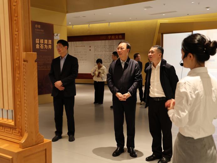 座谈会后,杨斌陪同严青松一行前往江西理工大学校史馆参观,并详细介绍了江西理工大学在有色金属与关键矿产领域的发展历程、学科优势、科研积淀及取得的重大成果,重点讲解了学校在服务国家及地方矿产资源产业发展、培育行业专业人才等方面的重要贡献。