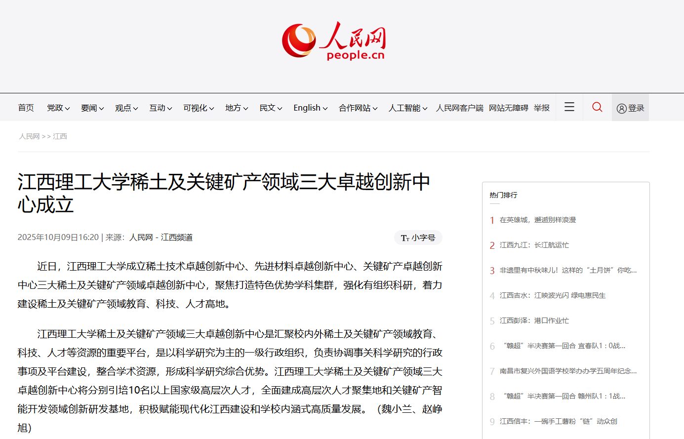 《人民网》:江西理工大学稀土及关键矿产领域三大卓越创新中心成立