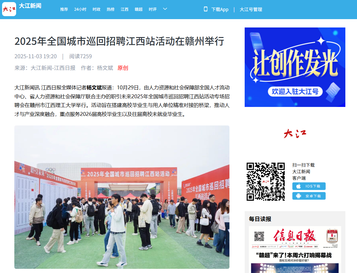 大江新闻讯 江西日报全媒体记者杨文斌报道:10月29日,由人力资源和社会保障部全国人才流动中心、省人力资源和社会保障厅联合主办的职引未来2025年全国城市巡回招聘江西站活动专场招聘会在赣州市江西理工大学举行。活动旨在搭建高校毕业生与用人单位精准对接的桥梁,推动人才与产业深度融合,重点服务2026届高校毕业生以及往届离校未就业毕业生。
