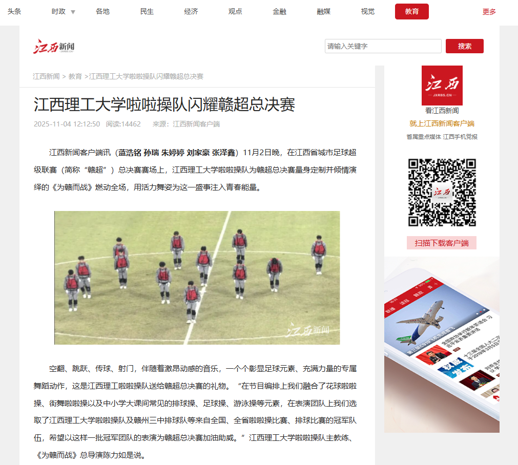 江西新闻客户端讯(蓝浩铭 孙瑞 朱婷婷 刘家豪 张泽鑫)11月2日晚,在江西省城市足球超级联赛(简称“赣超”)总决赛赛场上,江西理工大学啦啦操队为赣超总决赛量身定制并倾情演绎的《为赣而战》燃动全场,用活力舞姿为这一盛事注入青春能量。