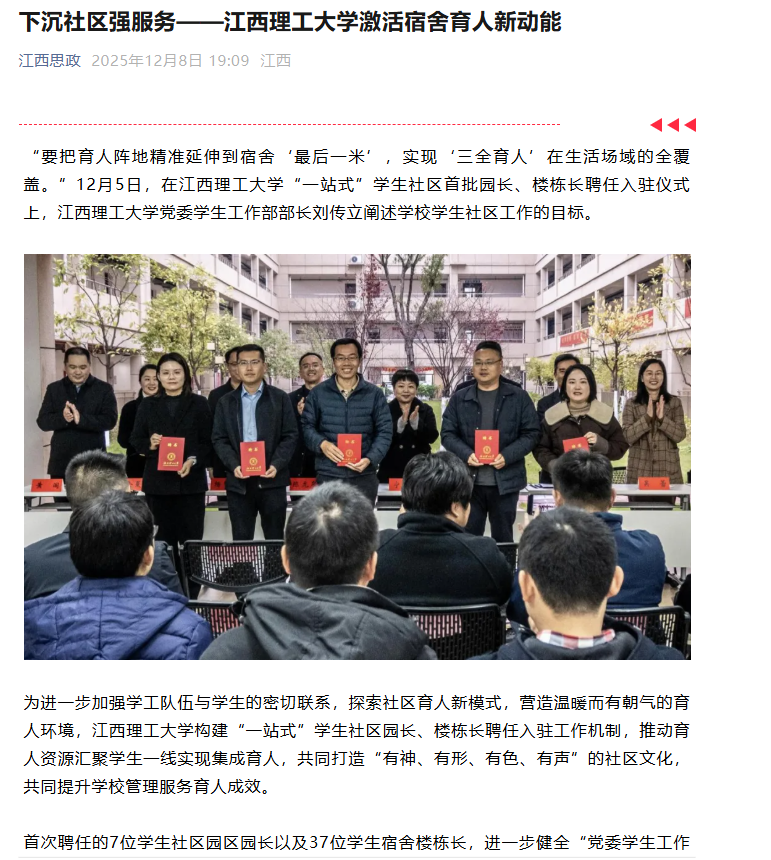 【江西思政微信公众号】:下沉社区强服务——江西理工大学激活宿舍育人新动能