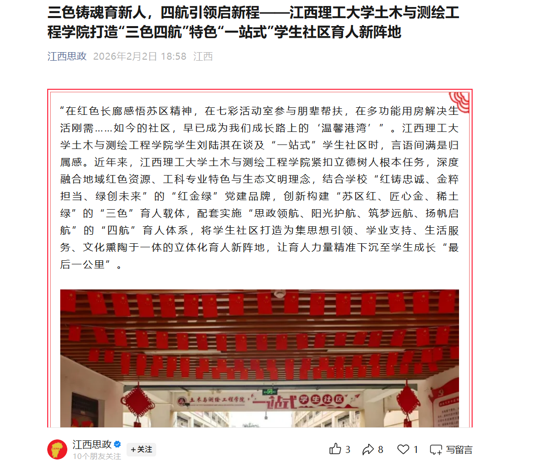 《江西思政》:三色铸魂育新人,四航引领启新程——江西理工大学土木与测绘工程学院打造“三色四航”特色“一站式”学生社区育人新阵地