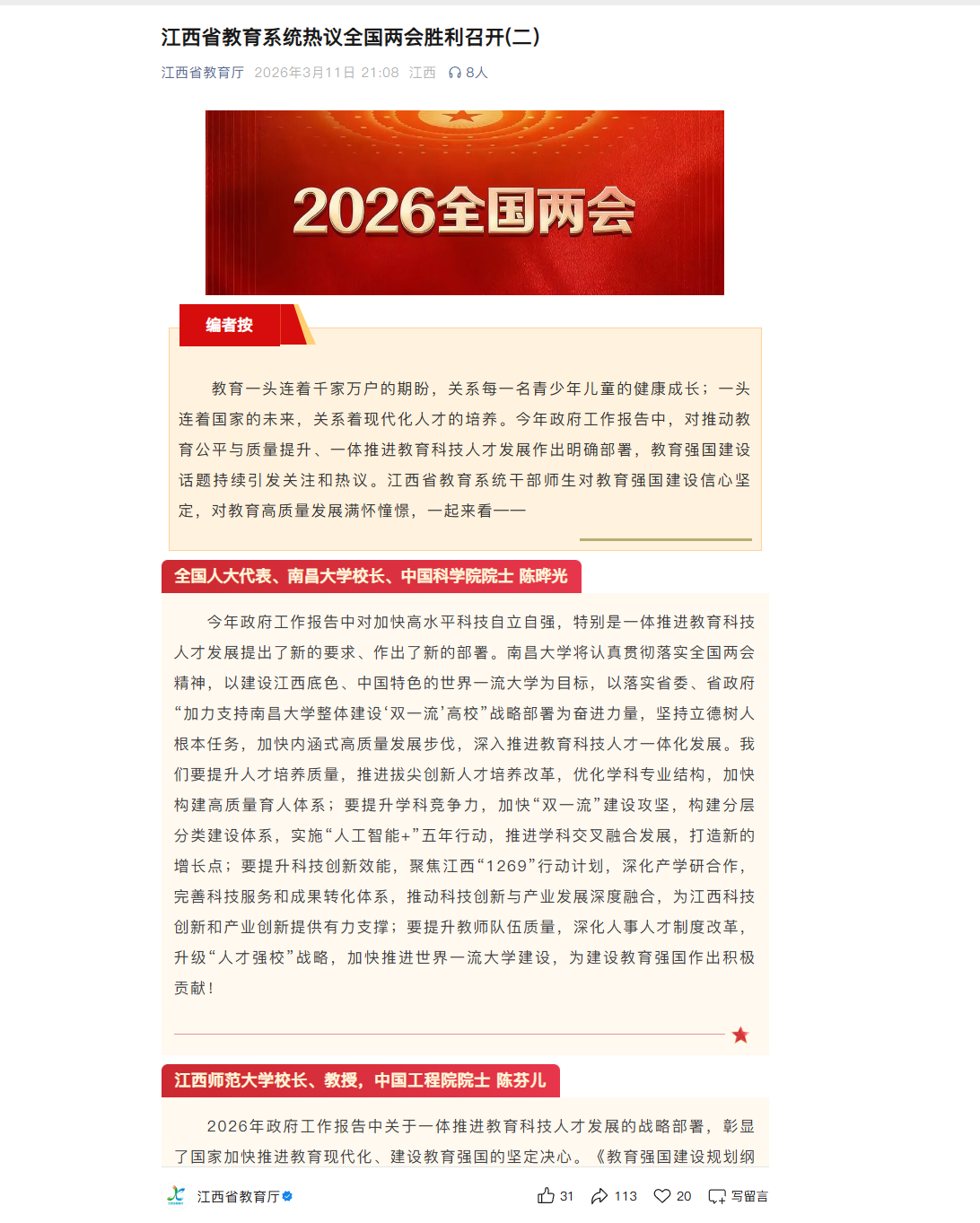 《江西教育厅》:江西省教育系统热议全国两会胜利召开(二)