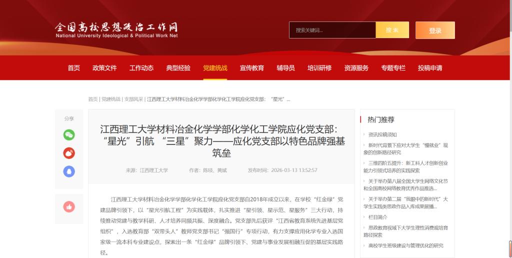 《全国高校思想政治工作网》:江西理工大学材料冶金化学学部化学化工学院应化党支部:“星光”引航 “三星”聚力——应化党支部以特色品牌强基筑垒