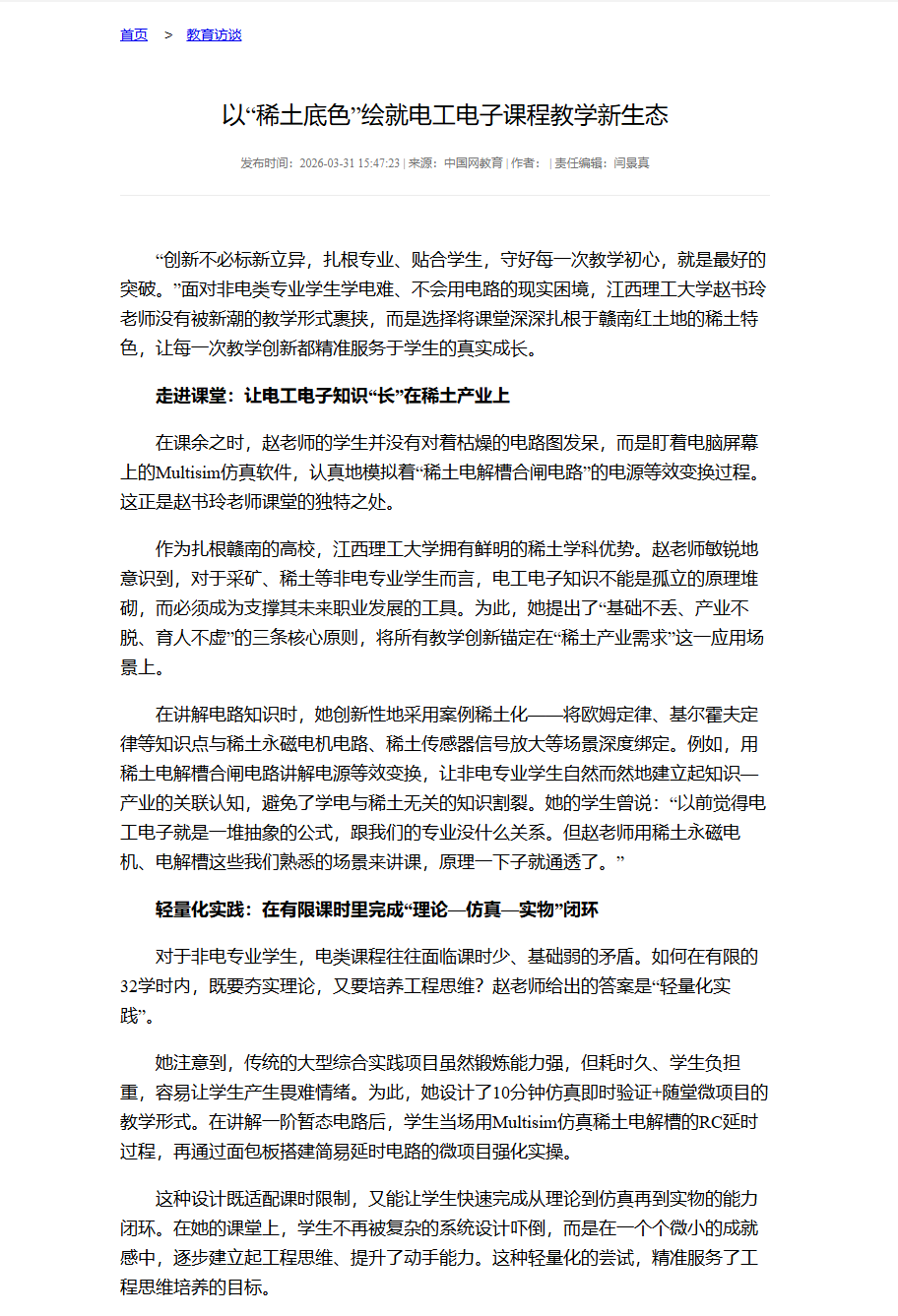 《中国网》:以“稀土底色”绘就电工电子课程教学新生态
