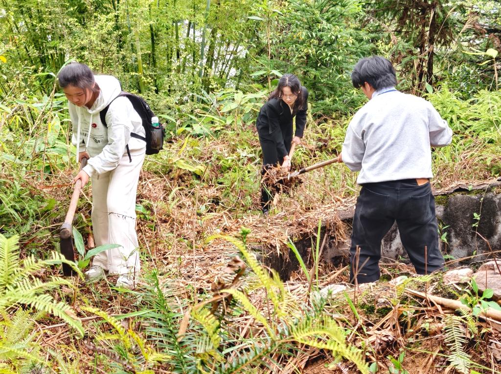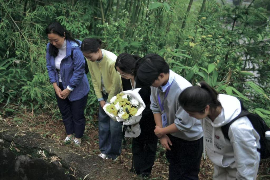 随后,在村支书的引领下,师生前往后山祭扫老红军张祥墓。张祥 1931 年参加红军,历任湘赣苏区红 8 军机枪连副连长,亲历多次反 “围剿” 作战并英勇负伤;返乡后初心不改,热心公益、关心教育,用一生践行革命信仰。同学们手持镰刀、锄头,认真清理墓碑周边杂草,指尖轻触微凉碑石,以朴素行动拂去岁月尘埃,深切感悟革命先辈的英勇无畏与无私奉献。清理完毕后,大家手捧鲜花敬献碑前,鞠躬默立,向老红军张祥致以崇高敬意,感念先辈以热血牺牲换来山河无恙、人民安康。